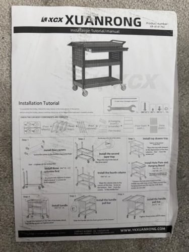 The XCX Three Tier Tool Cart is a nice addition to my workshop. I am using it to store all of my metal cutting tools (see Figure 1). In terms of quality, it is has some dimensional irregularities that make some parts an inexact fit (see Figure 2). It comes disassembled with a single page of instructions (Figure 3).