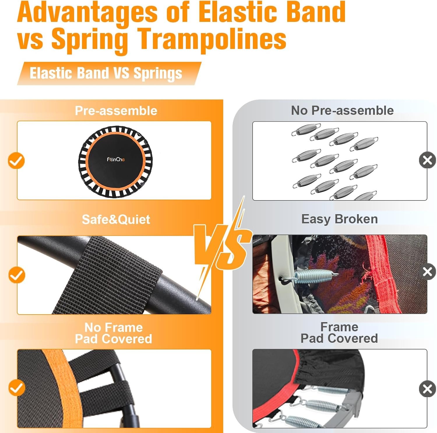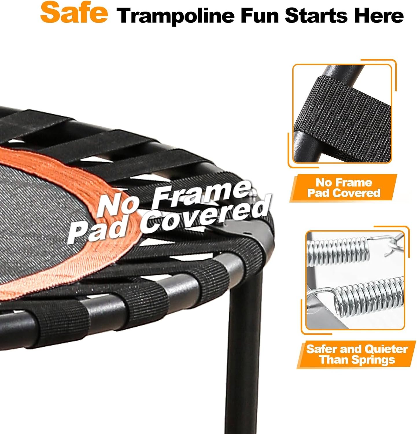 • Superior Bungee Bands〒Thicker. wider bungee bands offer a smooth. quiet workout and protect your knees and back. Our trampoline doesn’t have frame flat pads. but it’s safe and won’t break and shift. You can use it with confidence.