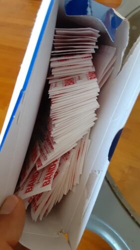 I like this bulk deal you see here. In this order, you receive 2 boxes of assorted sizes. Each box contains 3 sizes, giving a total of 100 bandaids per box. So, all in all, you received 200 bandaids. I have uploaded some pictures so you can see the size differences in comparison with each other.