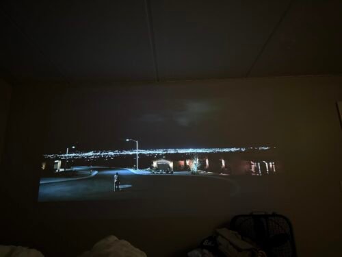 Some edges are a little blurred again not noticeable during the film, burn in after 6 months just a light faded color change in the middle noticeable in dark images. Small dead pixels, (might be dust on the light inside but I can’t reach it without getting a long screwdriver and taking it apart), not the easiest to get perfectly aligned but does a good job. Not great for low angles or high angles, better straight on like on camera stand or something. Somewhat dim in pitch black it works well and with just the smallest light you can still see, could be a bit brighter but still works, most projectors have that thing anyways. Not possible to get edge to edge image sharpness, I’ve tried for months but there’s always or corner or a side that is a little less sharp then the other but nothing major or noticeable when involved in a film. Weak speaker, hook up to something better to get full use.