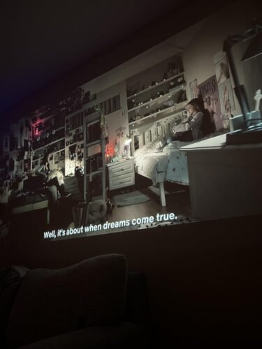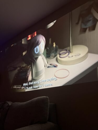 I’ve been using this in my kids’ room for movie nights — simply pointing it toward a white wall — and the quality is fantastic. Super sharp and plenty bright, even with some ambient light or setting sun spilling in the room.