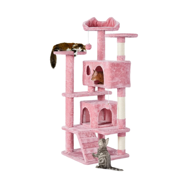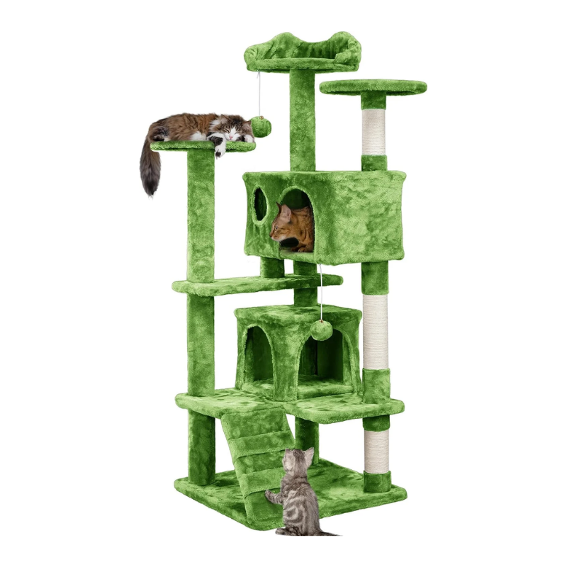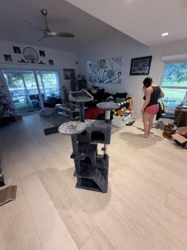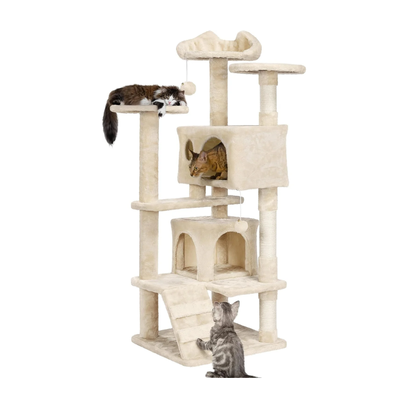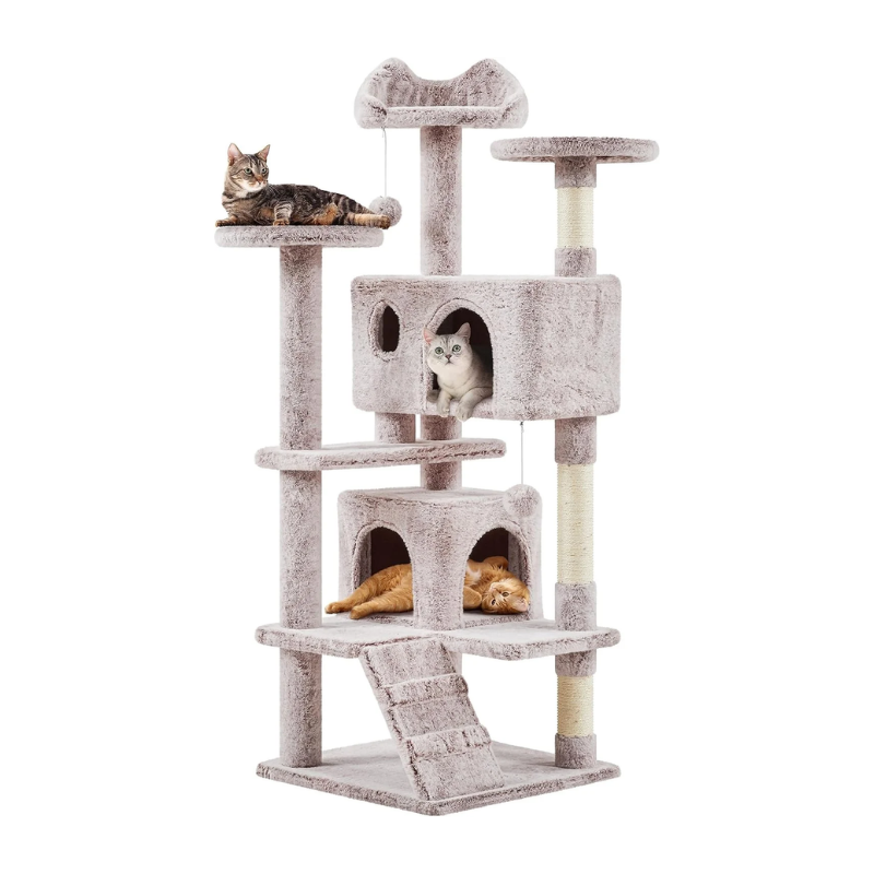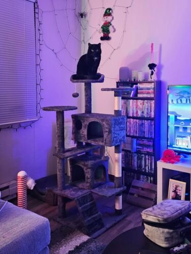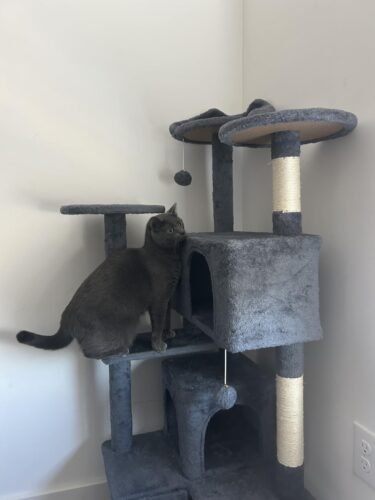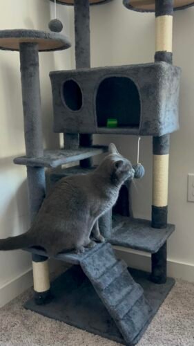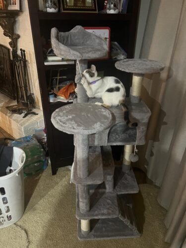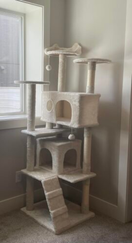 My cats use it every day, especially the scratching posts, which they love. It’s also a great height — tall enough to keep them entertained and give them a nice perch to sleep on. Cleaning is simple too; I just vacuum the fur off when needed.