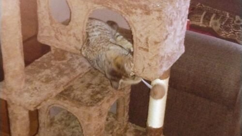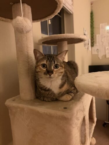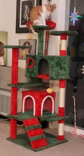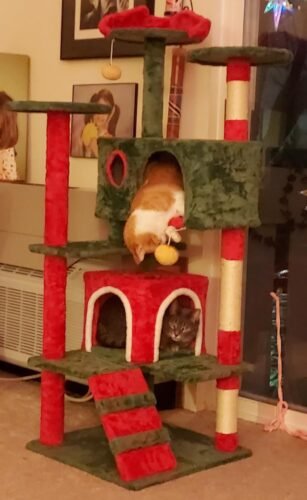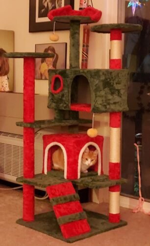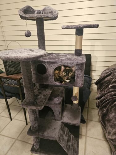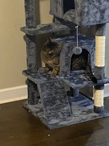 My cat Reba absolutely adores it. She is an only cat raised around dogs, so she is very active. She loves this cat tree. I’ve actually considered getting one for another room in the house. I’m not a crazy cat lady. She was rescued after falling out of the engine under a vehicle. I wasn’t even looking to adopt a cat.