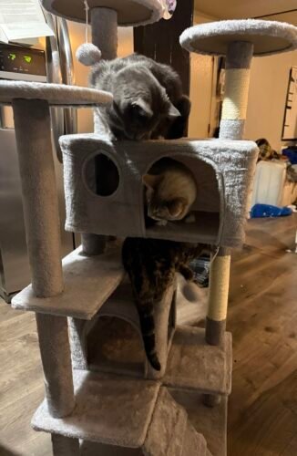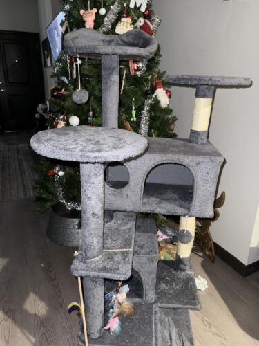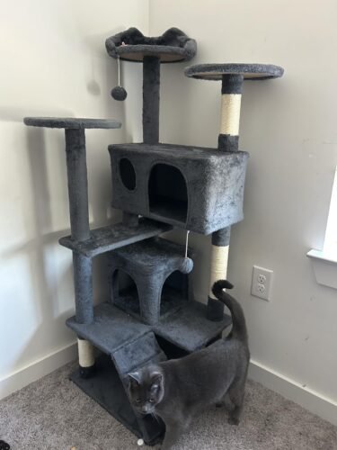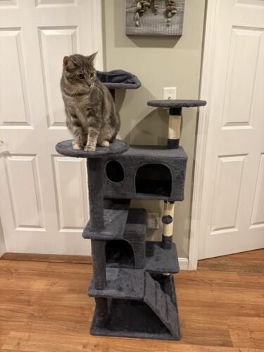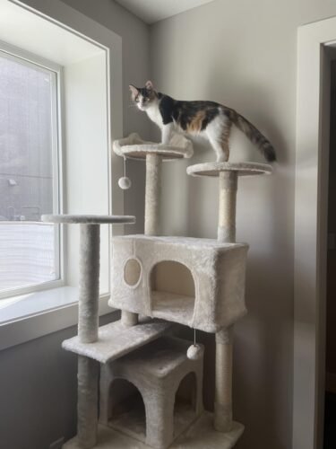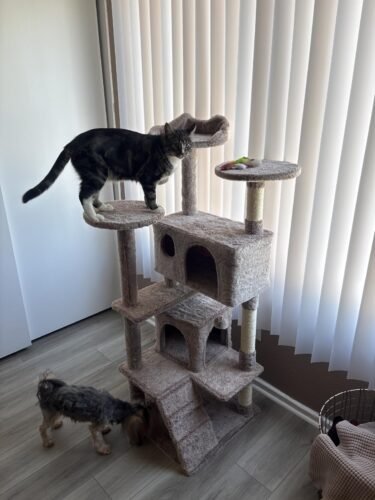 This cat tree offering has been accepted. It’s easy for both our two elderly cats and our youngest, whom is absolutely a unit of a cat, cat. All around a hit. The design is more structurally sound than some similarly priced cat trees in our experience as well, which was quite welcome.