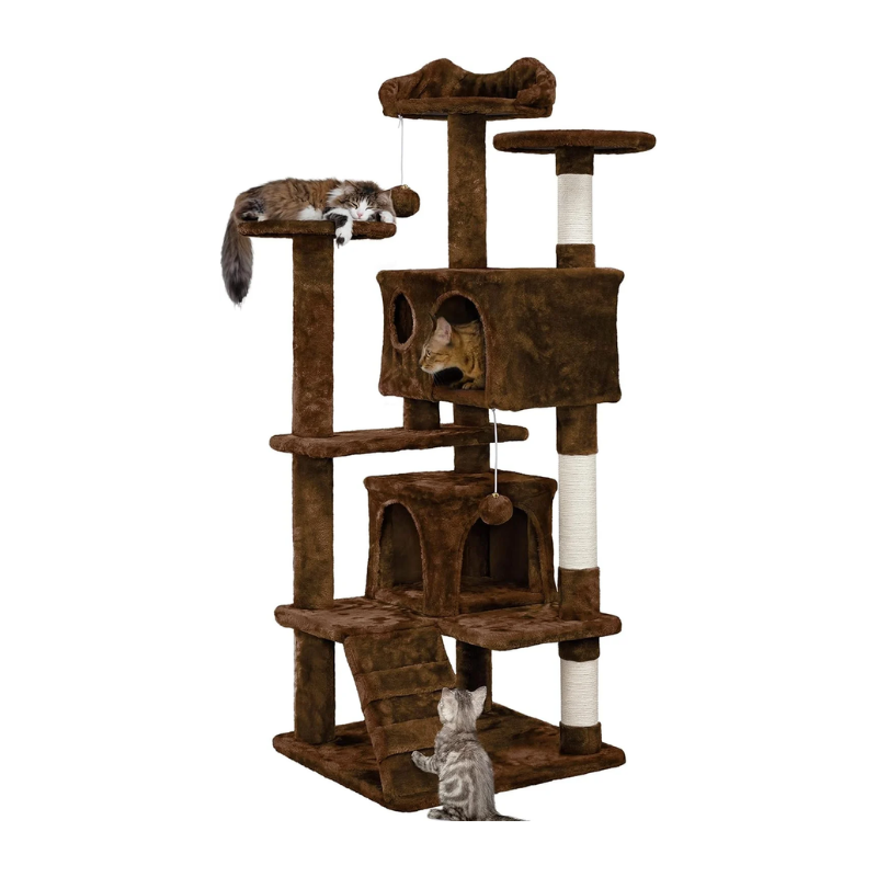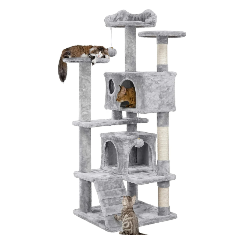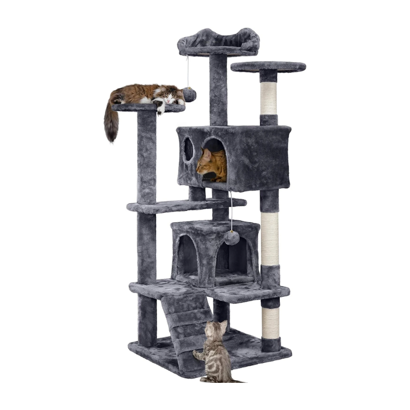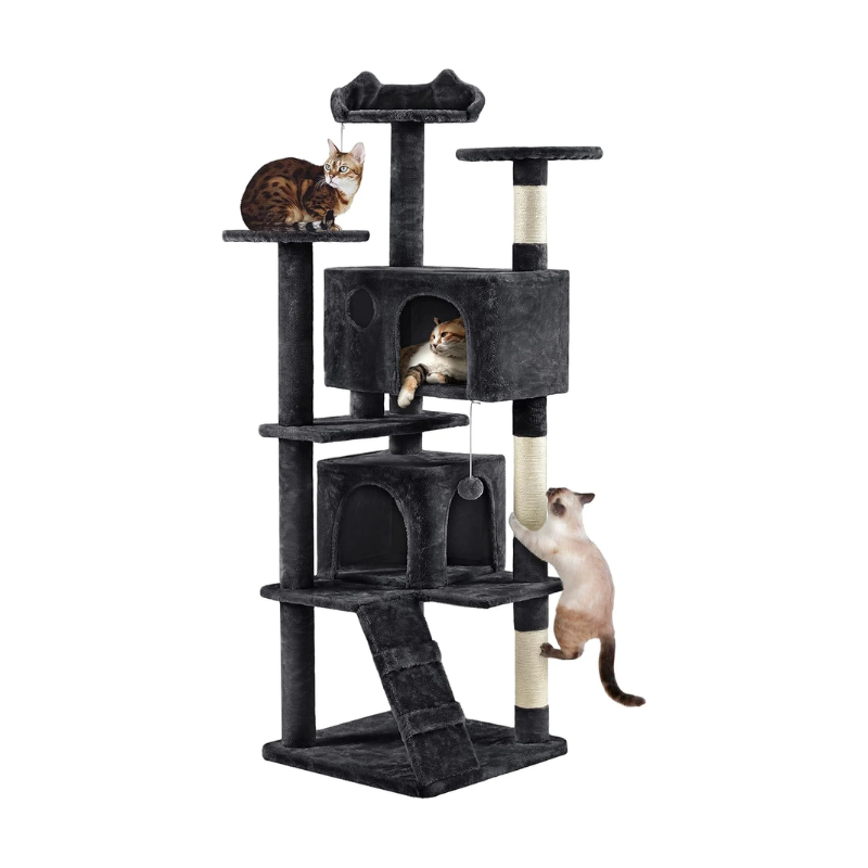 Yaheetech 54in Cat Tree. Multi-Level Cat Tower with Spacious Kitten-ear Perch. 2 Cozy Caves. Scratching Posts. Climbing Ladder. 2 Plush Balls. Durable Pet House Furniture for Indoor Kittens. Dark Gray